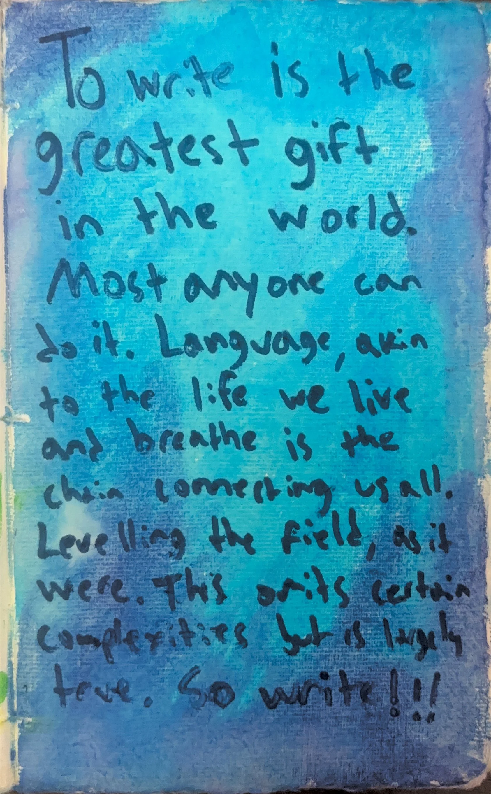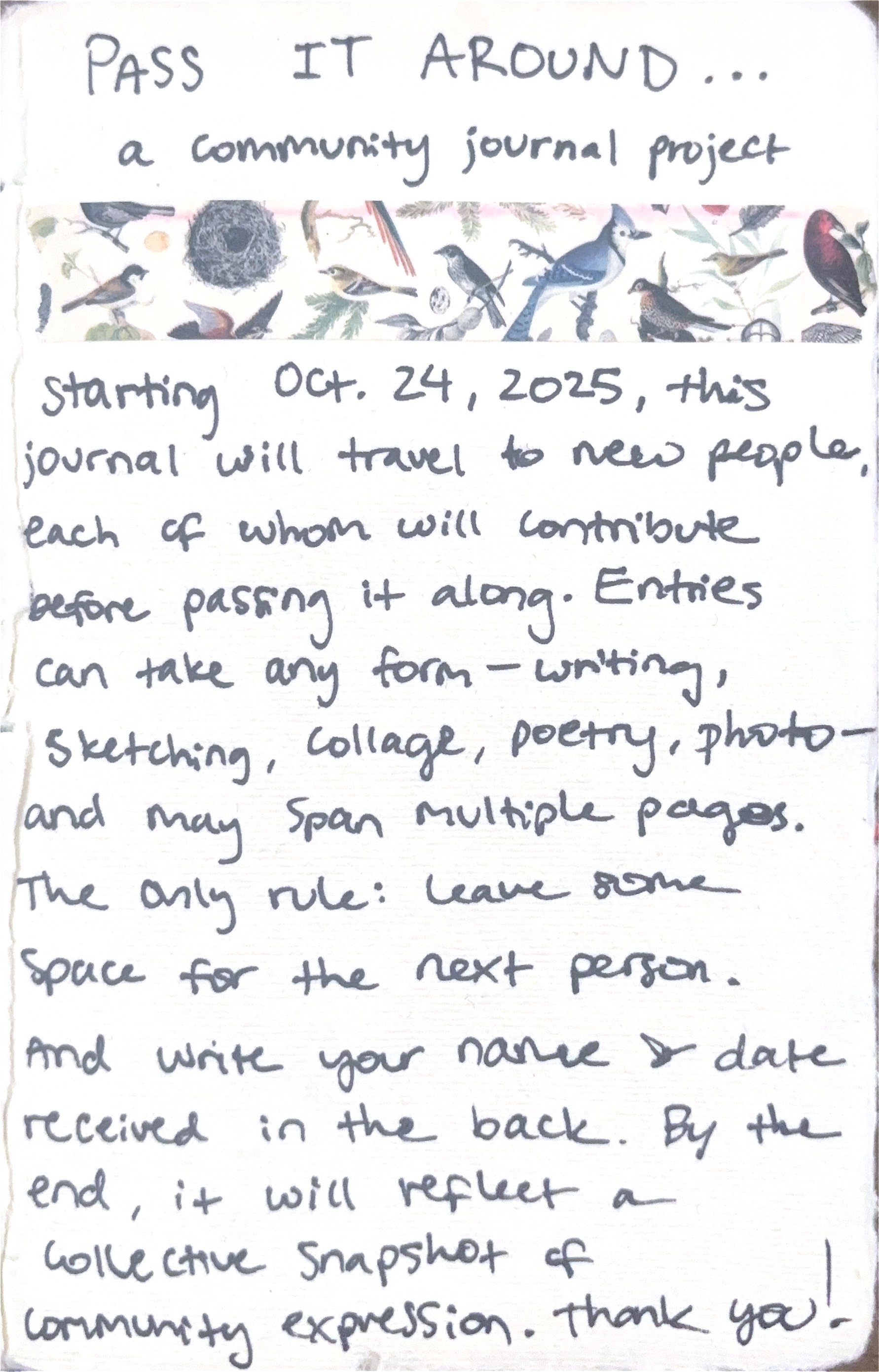 I keep a multitude of journals on me at all times: one for my advertising courses, one for my science communication work, and one for birding. I also have one for my personal life, all my inner thoughts and musings. For this personal project, I decided to get a blank journal and pass it around among my friends to highlight how the practice can become a communal activity. You can scroll through the entires below.