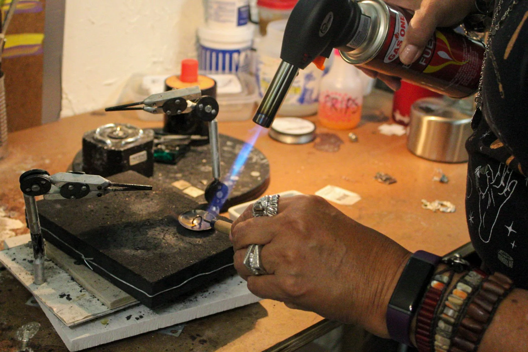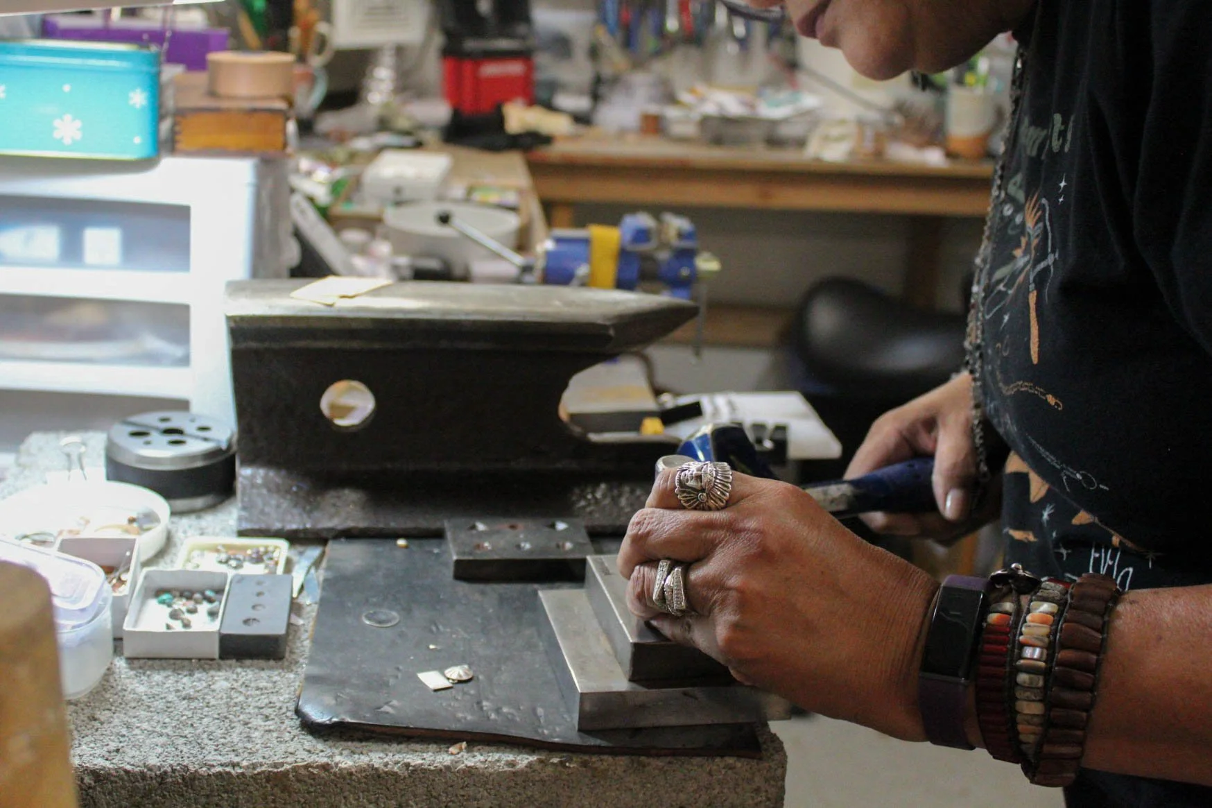 While hammering away at a piece of metal to stamp it with a design, Linda explains one of her favorite parts of making jewelry — the emotions. “Jewelry brings back positive memories for people. I’ve never met someone who had a negative experience with it,” she said.