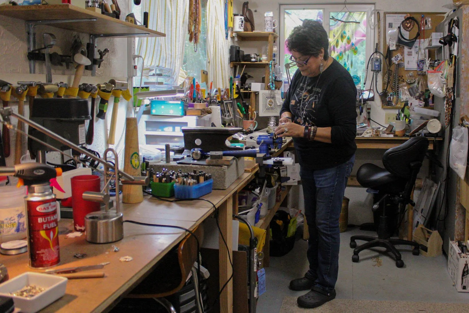 Linda Peterson, a Native American jewelry artisan from the Tule River tribe, files down a ring she is working on in her studio. Sitting on her property right off the Umpqua River in Scottsburg, Oregon, this small building houses her many tools, materials, and projects. Four years ago, she took a class to brush up on what she learned in the art classes she took while in college, and has been full-time silver-smithing ever since.
