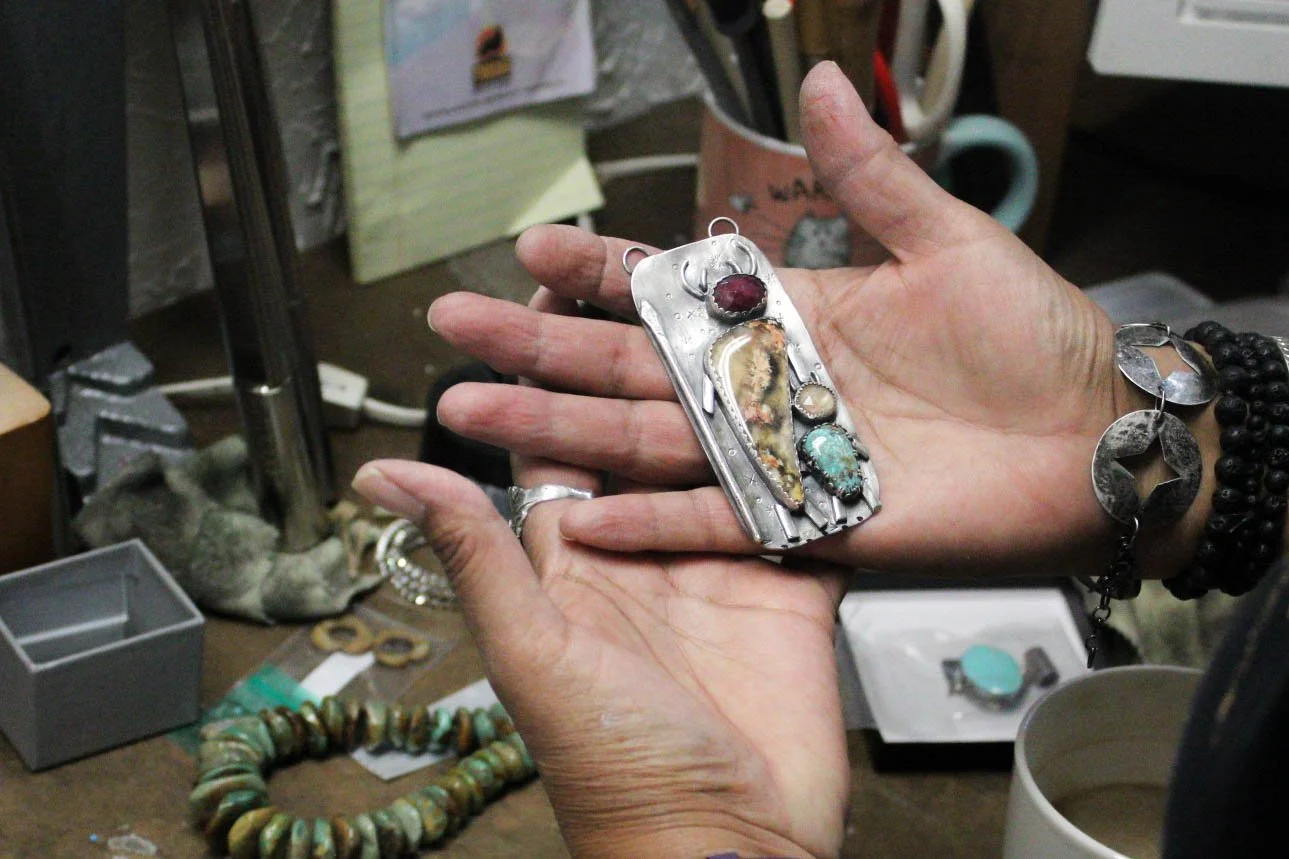 After adding some finishing touches to the piece, Linda takes in the pendant she has been piecing together for over a year. “Sacred Deer Dance” draws inspiration from Native celebrations honoring harvested deer. Linda uses designs and ceremonies from her culture and the stones themselves to inform the jewelry she makes.
