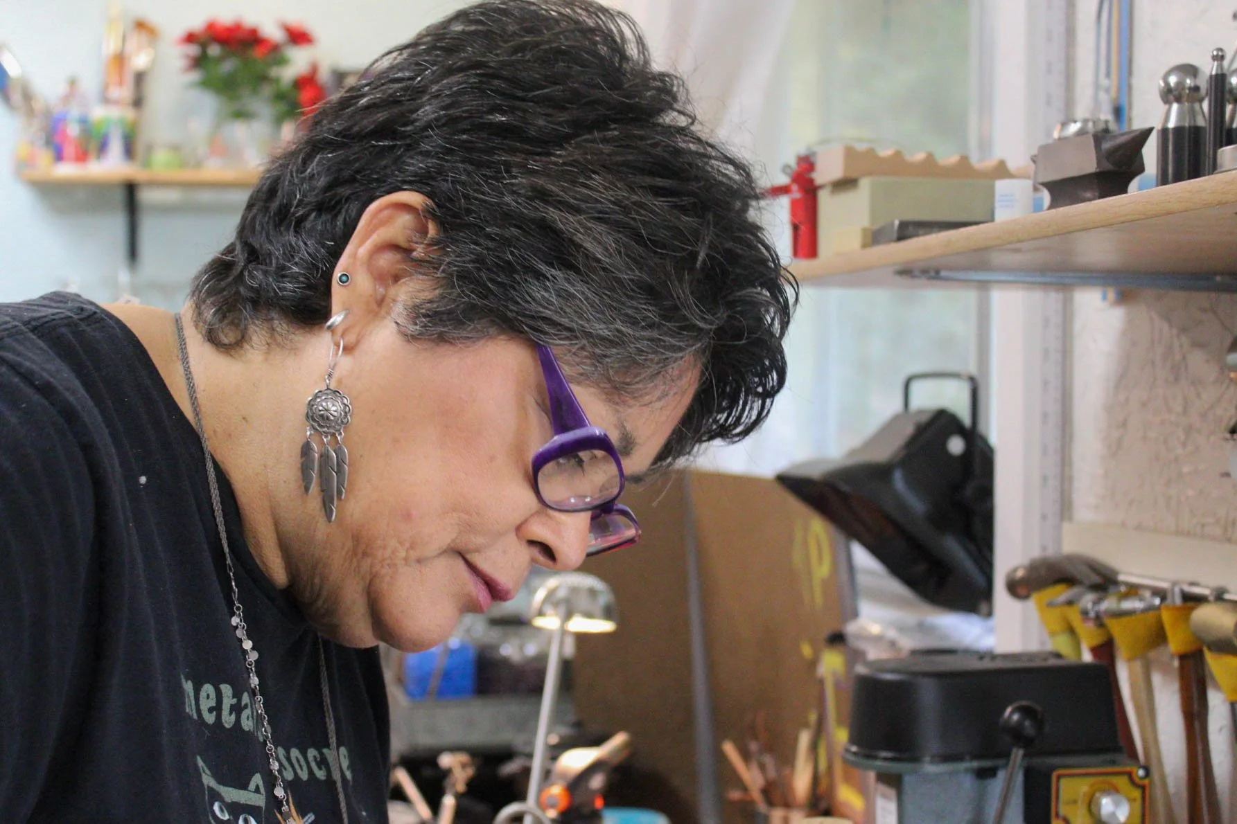 Wearing earrings that she purchased in support of another Native artist, Linda focuses on stamping a metal pendant for a necklace she’s constructing. She is a regular vendor at a variety of local markets and advocates for the support of fellow Native creatives by sharing the importance of purchasing directly from the artist.